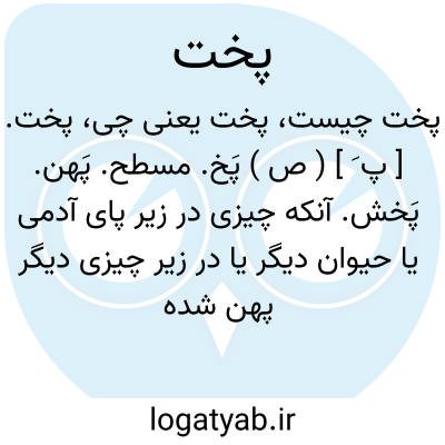 پخت. [ پ َ ] ( ص ) پَخ. مسطح. پَهن. پَخش. آنکه چیزی در زیر پای آدمی یا حیوان دیگر یا در زیر چیزی دیگر پهن شده باشد. ( برهان ). || ( اِ ) از اتباع و مزدوجه رخت است و در شمس اللغات آمده که پخت بالفتح با باء فارسی مترادف رخت است: