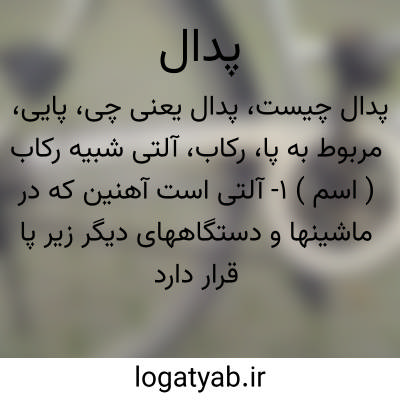 ( اسم ) ۱- آلتی است آهنین که در ماشینها و دستگاههای دیگر زیر پا قرار دارد ( ممکن است با یک صفح. لاستیکی روی آنرا بپوشند ) رکاب. ۲- رکاب دو چرخه. ۳- زبان. کوچکی است که در که در زیر پیانو قرار گرفته و نوازنده بهنگام لزوم برای کم و زیاد کردن صدا با پنج. پا بروی آن فشار میاورد. یا پدال ترمز. آلتی است آهنین شبیه رکاب در اتومبیل که در زیر پای راننده قرار دارد و با فشار دادن آن ماشین از حرکت باز می ایستد و ترمز می کند. یا پدال گاز. آلتی است آهنین در اتومبیلی که زیر پای راننده قرار دارد و باکمک آن راننده میتواند مقدار گازی ( گاز قابل اشتعال مانند مخلوط هوا و بنزین ) را که داخل سیلندرها میشود زیاد و کم نماید.