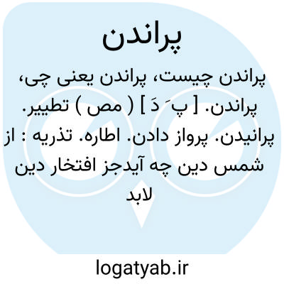 لابد که باز باز پراند ز آشیان.سوزنی.|| افکندن. پرتاب کردن.انداختن. || در تداول عوام، گاه گاه پنهانی تباهی کردن زن چنانکه در تک پراندن و تک پرانی. || کلمه درشت و بی جا در سخن آوردن. || لاف زنی و مبالغه در مدح کسی و تعریف بیجا کردن از مصطلحات. ( غیاث اللغات ).