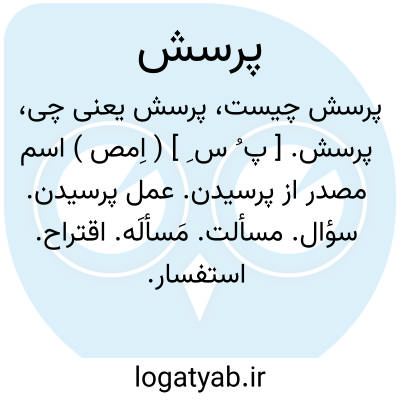 پرسش. [ پ ُ س ِ ] ( اِمص ) اسم مصدر از پرسیدن. عمل پرسیدن. سؤال. مسألت. مَسألَه. اقتراح. استفسار. پژوهش. استعلام. استخبار. استطلاع. تحقیق: