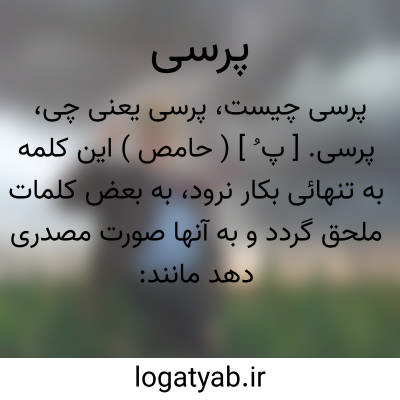 پرسی. [ پ ُ ] ( حامص ) این کلمه به تنهائی بکار نرود، به بعض کلمات ملحق گردد و به آنها صورت مصدری دهد مانند: احوالپرسی. بیمارپرسی.