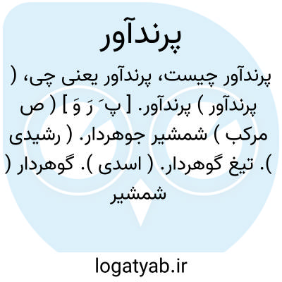 ( پرندآور ) پرندآور. [ پ َ رَ وَ ] ( ص مرکب ) شمشیر جوهردار. ( رشیدی ). تیغ گوهردار. ( اسدی ). گوهردار ( شمشیر و مانند آن ). تیغ گهردار. ( صحاح الفرس ). تیغ و شمشیرجوهردار. ( برهان ) ( جهانگیری ). برندآور: