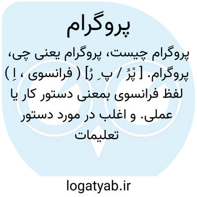 پروگرام. [ پْرُ / پ ِ رُ] ( فرانسوی، اِ ) لفظ فرانسوی بمعنی دستور کار یا عملی. و اغلب در مورد دستور تعلیمات مدارس بکار میرود.و امروز کلمه برنامه بجای آن معمول است. برنامه.