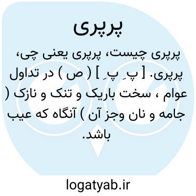 پرپری. [ پ ِ پ ِ ] ( ص ) در تداول عوام، سخت باریک و تنک و نازک ( جامه و نان وجز آن ) آنگاه که عیب باشد. یک عبای پِرپِری ( در زمستان آنگاه که جامه سطبر ضرور است ). یک تکه نان پرپری ( قطعه ای از نان سخت نازک و تنک که سیری نیاورد ).