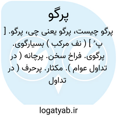 پرگو. [ پ ُ ] ( نف مرکب ) بسیارگوی. پرگوی. فراخ سخن. پرچانه ( در تداول عوام ). مکثار. پرحرف ( در تداول عوام ). قوّال. آنکه بسیار سخن گوید. بسیارسخن. درازنفس. پرسخن. روده دراز ( در تداول عوام ). پرروده. شاجب ( در تداول عوام ). ورّاج.