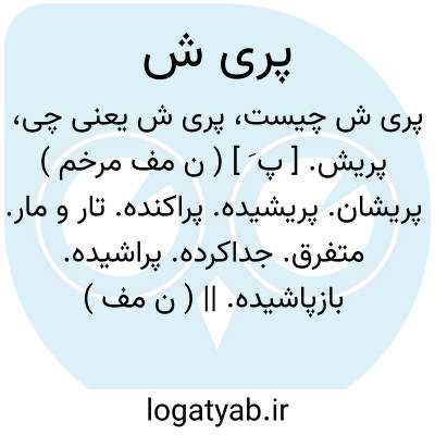 ( صفت ) ۱- پریشان. ۲- بباد داده فرو فشانده بیفشانده: زلف پریش جعد پریش. ۳- ( اسم ) در ترکیب معنی ( پریشنده ) و ( پریشان کننده ) دهد: خاطر پریش لغو پریش خاک پریش. پریشان ( صفت ) ۱- در حال پریشانی در حال پریشیدن. ۲- ژولیده آشفته بهم بر آمده پشولیده بشوریده در هم و بر هم آشفته وژگال آلفته. ۳- پراکنده پریشیده پراشیده پریش متفرق متشتت. ۴- سر گردان سرگشته دلتنگ مضطرب متوحش بیحواسی بد حال محزون. ۵- تهی دست تنگدست بی چیز فقیر بی بضاعت. یا بخت پریشان. بخت بد طالع بد تقدیر ناسازگار. یا حدیث پریشان. داستان و کلام پراکنده و بی اساس. یا خواب پریشان. خواب آشفته و در هم و بر هم. یا سخن پریشان. سخن بیهوده کلام بی ترتیب گفتار نامربوط.