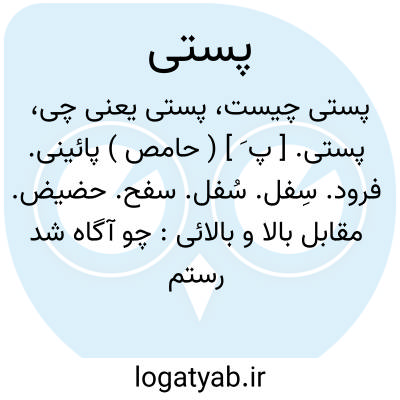 ( اسم ) ۱- فرودی پایینی. ۲- حضیض سفل مقابل بالا بلندی. ۳- زمین پست مقابل بلندی. ۴- گودی. ۵- نشیب قنوع. ۶- کوتاهی کم ارتفاعی. ۷- انحطاط انخفاض. ۸- خواری زبونی بیاعتباری ذلت. ۹- نانجیبی پست فطرتی ناکسی رذالت دنائت خست. ۱٠- تنگ چشمی کوته نظری. یا به پستی افتادن. بیچاره و مفلوک شدن.