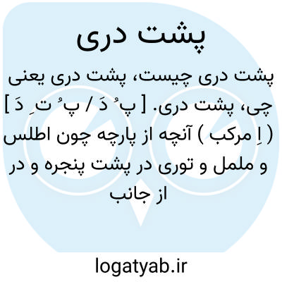 پشت دری. [ پ ُ دَ / پ ُ ت ِ دَ ] ( اِ مرکب ) آنچه از پارچه چون اطلس و ململ و توری در پشت پنجره و در از جانب اطاق آویزند تا از شدت تابش آفتاب بدرون کاسته شود.