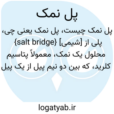 {salt bridge} [شیمی] پلی از محلول یک نمک، معمولاً پتاسیم کلرید، که بین دو نیم پیل از یک پیل گالوانی قرار داده می شود