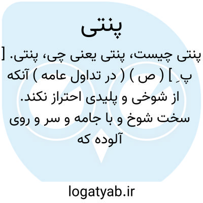پنتی. [ پ ِ ] ( ص ) ( در تداول عامه ) آنکه از شوخی و پلیدی احتراز نکند. سخت شوخ و با جامه و سر و روی آلوده که نظافت نداند، در اصطلاح «مشتیان » مقابل لوطی، جَبان. بی حمیت. بی غیرت. چرک. دَنِس. قذر. لاابالی در پاکی و نظافت. فِژاکن. پَچل َ.