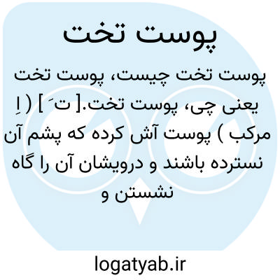 پوست تخت.[ ت َ ] ( اِ مرکب ) پوست آش کرده که پشم آن نسترده باشند و درویشان آن را گاه نشستن و خفتن چون گستردنی وبساطی گسترند و گاه رفتن بر دوش افکنند و آن از پوست گوسفند و گاهی شیر و ببر و پلنگ باشد: