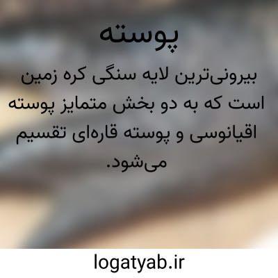 پوسته (سیاره). پوسته لایهٔ سخت بیرونی سیارات است. پوسته قسمتی از لیتوسفر است و از انواع مختلفی از سنگ ها ساخته شده است. از جمله: سنگ آذرین، سنگ رسوبی و سنگ دگرگونی. در پایین پوسته گوشته است. پوستهٔ زمین دارای دو بخش متفاوت است: پوستهٔ قاره ای و پوستهٔ اقیانوسی. ضخامت پوسته در نقاط مختلف زمین بین ۵ تا ۷۰ کیلومتر است. پوسته قشر نسبتاً نازکی در اطراف کرهٔ زمین است. ترکیب و ساختمان پوسته در زیر قاره ها و اقیانوس ها با هم متفاوت است. پوستهٔ زمین در زیر قاره ها از دو لایهٔ سیلیسیم و آلومینیم و سیلیسیم و منیزیم و آهن درست شده است.
