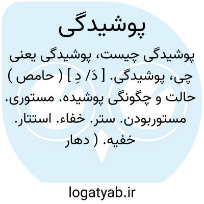 پوشیدگی. [ دَ/ دِ ] ( حامص ) حالت و چگونگی پوشیده. مستوری. مستوربودن. ستر. خفاء. استتار. خفیه. ( دهار ). احتجاب. کسوف. غماء. ( دهار ). خافیة. ( منتهی الارب ):