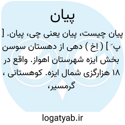 پیان. [ پ َ ] ( اِخ ) دهی از دهستان سوسن بخش ایزه شهرستان اهواز. واقع در 18 هزارگزی شمال ایزه. کوهستانی، گرمسیر، دارای 180 تن سکنه. آب آن از چشمه. محصول آنجا گندم و جو. شغل اهالی زراعت. راه آن مالرو است. ( فرهنگ جغرافیایی ایران ج 6 ).