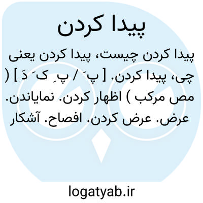 پیدا کردن. [ پ َ / پ ِ ک َ دَ ] ( مص مرکب ) اظهار کردن. نمایاندن. عرض. عرض کردن. افصاح. آشکار کردن. ظاهر ساختن. واضح کردن. روشن کردن. هویدا کردن. صَدع. ( منتهی الارب ). ابراز. تجلیة. ( مجمل اللغة ). نُحلة. نِحلة. توضیح. ( منتهی الارب ).ایضاح. کشف. اجلاء. ابداء. بوح. اِشرار. ( منتهی الارب ). پدیدار کردن. پدید کردن. پدید آوردن: