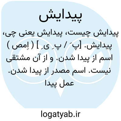 ( اسم ) ۱ - ظهور تکون پیدایی. ۲- ایجاد بوجود آمدن: او را ( طرغلودیس را ) در ریزانیدن سنگ مثانه و باز داشتن از پیدایش سنگ خاصیتی شگفت است. یا سفر پیدایش. سفر تکوین ( از تورات ). توضیح در قدیم پیدایی بعنوان حاصل مصدر استعمال میشد و پیدایش یکی از موارد استثنایی است که اسم مصدر شینی از غیر فعل مشتق شده.