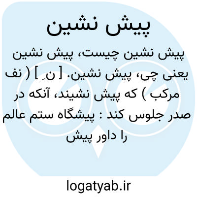 ( صفت ) ۱- آنکه در صدر جلوس کند: پیشگاه ستم عالم را داور پیش نشین بایستی. ( خاقانی ) ۲- آنکه در پیش کسی یا چیزی نشیند آنکه در برابر و نزدیک جا گیرد: پروانه که نور شمع افروخت چون پیش نشین شمع شدن سوخت. ( نظامی ) ۳- زنی که هنگام زادن زن حامله در پیش وی نشیند و او را یاری کند قابله ماما مام ناف.