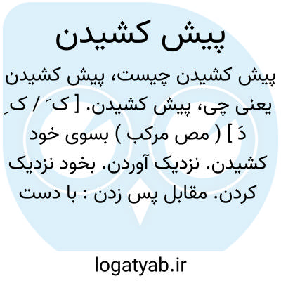 ( مصدر ) ۱- بسوی خود کشیدن بخود نزدیک کردنمقابل پس زدن:با دست پس میزد و با پا پیش میکشید. ۲- مطرح کردن عنوان کردن ( مطلبی یا سخنی را ). ۳- بزیز افکندن ( چنانکه سر را ): از شرم سر پیش افکند. ۴- برافراختن و آخته داشتن( چنانکه سر را ): سران سپه سر کشیدند پیش که ریزیم در پای تو خون خویش. ( نظامی ) ۵- تقدیم کردن پیشکش کردن: نیم جانی که هست پیش کشم جون بدست من این قدر باشد. ( ازالعراضه. لغ. ) ۶- ریشخند کردن استهزائ کردن.