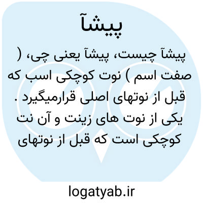 ( صفت اسم ) نوت کوچکی اسب که قبل از نوتهای اصلی قرارمیگیرد. یکی از نوت های زینت و آن نت کوچکی است که قبل از نوتهای اصلی قرار میگیرد و آن بر دو قسم است. یا پیشای تحتانی. یک دوم از نوت اصلی بم تراست. یا پیشا فوقانی. یک دوم از نوت اصلی بالاتر نوشته میشود. این دو را پیشای ساده گویند. باید دانست که پیشا امکان دارد که مضاعف باشد در این صورت پیشای فوقانی و تحتانی متفقا قبل از نوت اصلی واقع میشود. در صورتیکه پیشا ساده باشد بصورت چنگ خط خورده و اگر مضاعف باشد مانند دولا چنگ های کوچک نوشته میشود.