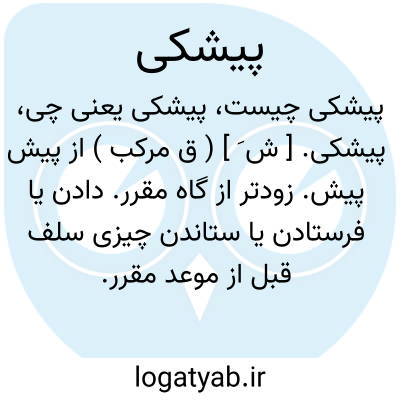 پیشکی. [ ش َ ] ( ق مرکب ) از پیش پیش. زودتر از گاه مقرر. دادن یا فرستادن یا ستاندن چیزی سلف قبل از موعد مقرر. سلف. قبلاً؛ استسلاف؛ بها پیشکی گرفتن. || به مساعده. بطور مساعده.