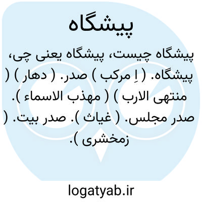 ( اسم ) ۱- صدراطاق صدر مجلس بالای مجلس مقابل پایگاه: سپارم ترا گنج و تخت و کلاه نشانمت با تاج در پیشگاه. ( شا. بخ ۱۶۳۸: ۶ ) شکر و سپاس مر موجدی را که از پیشگاه عقل تا پایگاه طبع هر که هست در تحت او امر و نواهی اوست.۲- رئیسصدردارای مقام عالی: ناکسان پیشگاه و کامروا فاضلان دور مانده وین عجب است. ( علی ابن اسد امیر بدخشان ) ۳- پادشاه سلطان: ستاره شعر چون بر آشفت شاه بدو گفت کای نامور پیشگاه. ( شا. لغ. ) از چو تو محتشم فرو زد ملک و ز چو تو پیشگاه نازدگاه. ( مسعودسعد ) ۴- تخت مسند: چنین گفت پیر خراسان که شاه چو بنشست بر نامور پیشگاه... ( شا. لغ. ) ۵- کرسی و صندلیی که در پیش تخت ( سلطان یاامیری ) نهند: دبیر جهاندیده را پیش خواند بر آن پیشگاه بزرگی نشاند. ( شا. لغ. ) ۶- صحن سرای و خانه فضای جلو عمارت جلو خوان: بر حسب فرموده در پیشگاه ساحت خانقاه متصل بصف. جنوبی قبه ای فلک مثال بر افروختند. ۷- فرشی که پیش خانه افکنند زیلوچه: گفتند مجالس باشد ( یعنی ز خرف ) و نشستگاهها از نهالیها و متکاها و پیشگاهها. یا پیشگاه مسجد. محراب مسجد: در پیشگاه مسجد و در کنج صومعه یک پیر کار دیده و یک مرد کار کو? ( عطار ) یا پیشگاه نشور. قیامت: ببین که تا چه نشیب و فراز در کار ست ز آستان عدم تا به پیشگاه نشور? ( ظهیر )