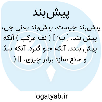 ( صفت ) آنکه پیش بندد کسی که جلو گیرد آنکه سد و مانعی برابر کسی یا چیزی ایجاد کند.۲-پارچه ای مربع مستطیل که از زیر گلو بپایین یاازکمر بپایین فرو آویزند و طرفین آنرا با بندی گرد کمر بندند تا جامه پاکیزه ماند ( هنگام طباخی خیاطی آرایش و جز آن ) پیش سینه پیش دامن: ارپوشیم بناب و ببندم ز پیش بند تا آن ز بقچ. که و این از میان کیست ? ( نظام قاری ) پیشخدمت آنجا پیش بند چرک آبی رنگ خودش را بسته و مشغول گرد گیری است. ۳- بند مقدم بر بندهای دیگر در زین و برگ اسب و پالان خر و جز آن.