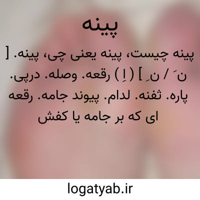 پینه. [ ن َ / ن ِ ] ( اِ ) رقعه. وصله. درپی. پاره. ثفنه. لدام. پیوند جامه. رقعه ای که بر جامه یا کفش دریده و جز آن دوزند. درپه. دژنگ. باز افکن. پرگاله. صاحب انجمن آرا و بتبع وی صاحب آنندراج آرد:پارچه که بر کفش و جامه و خرقه گذاشته بدوزند و آنرا بعربی وصله گویند که سبب وصل دو پارچه شکافته گردد و این در اصل پی نه بوده است بفتح بای پارسی و کسر نون یعنی چیزی که در پی چیزی می نهاده اند و آنرا در پی نیز گویند: و پیاده در بازار رفتندی و پیراهن ها از پنبه و پینه درشت بر آن دوخته تا نیمه ساق ( تجارب السلف ). || شوغ. شغه. شغ. شوخ. سرو. کبره.کوره. ستبری که در پوست دست یا پای از کار یا رفتن پدید آید. ستبری که از کار و نشستن و رفتن در کف دست و پای و زانو و غیره پدید آید. کلفتی پوست دست و پا. برآمدگی سخت که بر پای و دست از بسیاری کار و بر پیشانی از کثرت سجده پیدا شود. پوست دست و پا و اعضا که بسبب کار کردن سخت و سطبر شده باشد. ( برهان ). جزئی از پوست که برتن سخت شده باشد از کار کردن. پوست دست و زانو و کف پا و پاشنه پا که بواسطه کار کردن سطبر و سخت شود یا شکافته شود ( آنندراج ). صلابتی که بر زانوی شتر از بسیاری سودن بر زمین و بر پیشانی عباد از کثرت سجود و امثال آن پدید آید. قسمتی از بشره که بعلت بسیار سائیده شدن ستبر شود و بعضی زاهدان ریائی با قاشق چوبی داغ کرده که مدتی گاه و بیگاه بر پیشانی نهند پینه عملی و مصنوع در آن پیدا آرند و بمریدان چنان نمایند که از اثر کثرت سجده است. شوخ بسته بر مساجد سبعه آدمی و بر سینه و زانوی شتر و امثال آن. ثفنه؛ پینه زانو. ( دهار ). || پین. در اصطلاح بنائی، مقداری به اندازه کلفتی یک آجر از زمین. رجوع به پین شود.