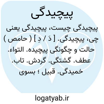 حالت و کیفیت پیچیدهالتوا ئخمیدگی تاب: لوائ الحیه پیچیدگی مار. یا پیچیدگی آواز. طنین آن انعکاس آن. یا پیچیدگی پا. پیچیدگی قوزک. یا پیچیدگی چشم.کاری.یا پیچیدگی زبان. گرفتگی زبان بهنگام تکلم لکنت زبان: تا هست حرف زلف تو سر داستان ما پیچیدگی برون نرود از زبان ما. ( دانش ) یا پیچیدگی در سخن ( کلام مطلب ). ایهام غموض تعقید روشن نبودن آن. یا پیچیدگی عضله.خوب رستن آنضخمی ماهیچه. یا پیچیدگی عضو. ناراستی آن تاب داشتن آن رگ برگ شدن.یا پیچیدگی قوزک. پیچیدگی پا التوائ قوزک.