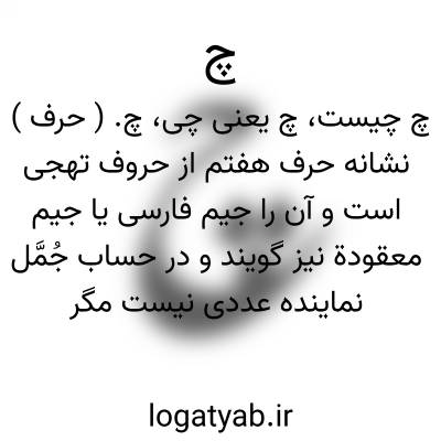 چ. ( حرف ) نشانه حرف هفتم از حروف تهجی است و آن را جیم فارسی یا جیم معقودة نیز گویند و در حساب جُمَّل نماینده عددی نیست مگر مانند جیم عدد سه بشمار آید، و در حساب ترتیبی نشانه عدد هفت است.