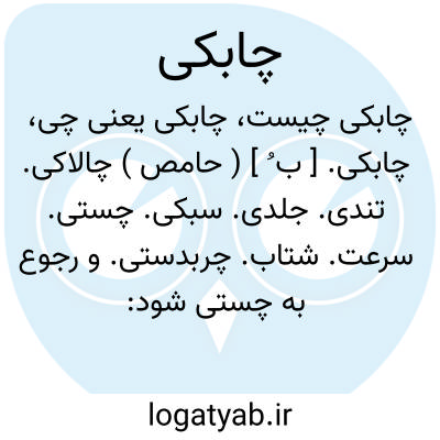 چابکی. [ ب ُ ] ( حامص ) چالاکی. تندی. جلدی. سبکی. چستی. سرعت. شتاب. چربدستی. و رجوع به چستی شود: جَلدَة؛ چابکی مردم و غیر وی. تَجَلّدَ؛ به تکلف چابکی کرد. تَصَرّم؛ چابکی کردن. ( منتهی الارب ):