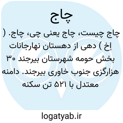 چاج. ( اِخ ) دهی از دهستان نهارجانات بخش حومه شهرستان بیرجند 30 هزارگزی جنوب خاوری بیرجند. دامنه معتدل با 521 تن سکنه، آب آن از قنات، محصول آنجا غلات و پنبه وزعفران و ابریشم، شغل اهالی زراعت و قالی بافی، راه آن مالرو است کلاته های نو، زنج، ابوطالب حسن یزدی، تاج کوه جزء این ده است. ( فرهنگ جغرافیائی ایران ج 9 ).
