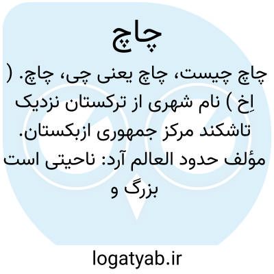 بسی پهلوان خواند زرین کمر.نظامی ( شرفنامه ).... و زبان مردم چاچ بهترین زبان هیطل است. ( ترجمه از احسن التقاسیم فی معرفة الاقالیم نقل از سبک شناسی ج 1 ص 245 ).... و بوضوح انجامید که آن غلام را دختر حاکم چاچ بنا بر آنکه از خوردی باز به او متعلق بوده از خانه پدر همراه آورده. ( حبیب السیرچ خیام ص 172 ). || راه چاچ؛ راهی از موسیقی است: