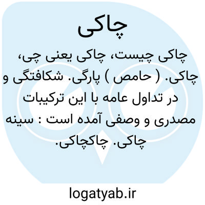 چاکی. ( حامص ) پارگی. شکافتگی و در تداول عامه با این ترکیبات مصدری و وصفی آمده است: سینه چاکی. چاکچاکی. قبا سه چاکی.