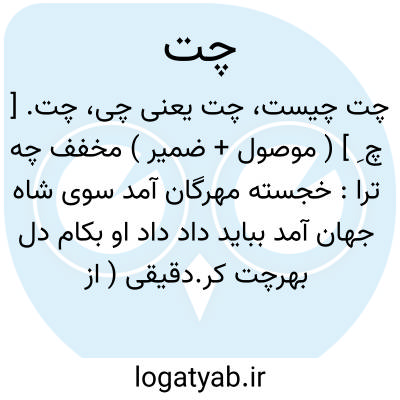 بر تو شیرین گردد و ایجاد حق.مولوی. || ( ادات استفهام + ضمیر ) چت است؛ چه چیز است ترا؟ چه میشود ترا؟ چه حال است ترا؟. چت شد؛ چه شد ترا؟ چه افتاد ترا؟. چت بود؟؛ چه بود ترا؟ چه افتاده بود ترا؟ چه بیماری یا چه گرفتاری بود ترا؟: