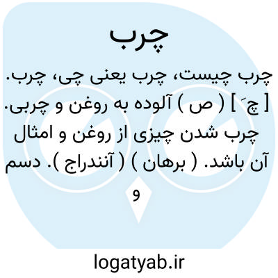 چرب. [ چ َ ] ( ص ) آلوده به روغن و چربی. چرب شدن چیزی از روغن و امثال آن باشد. ( برهان ) ( آنندراج ). دسم و روغنی و لزج و باچسب و صاف. ( ناظم الاطباء ). روغنین. روغن دار. مقابل خشک، که بمعنی کم روغن و روغن ندیده باشد. باروغن.پرروغن: طعام چرب. خورش چرب. غذای چرب: