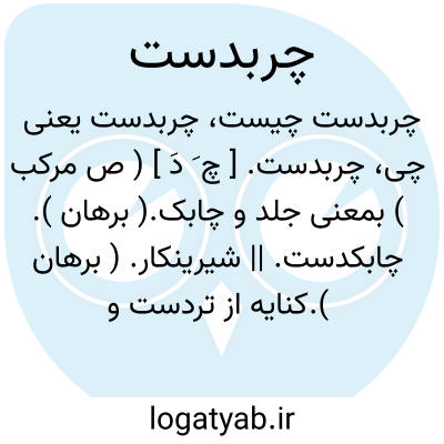 چربدست. [ چ َ دَ ] ( ص مرکب ) بمعنی جلد و چابک.( برهان ). چابکدست. || شیرینکار. ( برهان ).کنایه از تردست و شیرینکار باشد. ( انجمن آرا ) ( آنندراج ). خوشکار و شیرینکار. ( ناظم الاطباء ). آدم چست و تردست. ( فرهنگ نظام ). زبر و زرنگ. حقه باز: