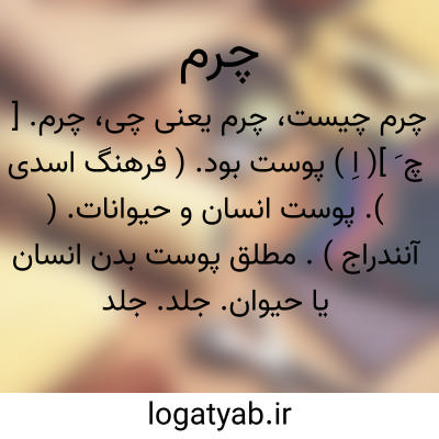 ( اسم )۱- پوست گاو یا شتر دباغی شده. ۲- پوست بدن انسان. یا چرم شیر. ۱- پوست شیر. ۲- تازیانه شلاق. یا چرم گور ۱- پوست گور خر.۲- چله و زه کمان.