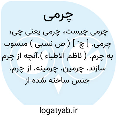 چرمی. [ چ َ ] ( اِخ ) مؤلف مرآت البلدان نویسد: «از قلعه جات چناران زعفرانلوی خراسان است که ده خانوار سکنه دارد و زراعتش از آب قنات مشروب میشود». ( از مرآت البلدان ج 4 ص 222 ). دهی از دهستان چناران بخش حومه شهرستان مشهد که در 59هزارگزی شمال مشهد واقع است. جلگه و معتدل است و 30 تن سکنه دارد. آبش از قنات، محصولش غلات بنشن، شغل اهالی زراعت و مالداری وراهش مالرو است. ( از فرهنگ جغرافیایی ایران ج 9 ).