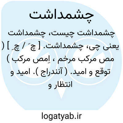 چشمداشت. [ چ َ / چ ِ ] ( مص مرکب مرخم، اِمص مرکب ) توقع و امید. ( آنندراج ). امید و انتظار و توقع و آرزو و خواهش. ( ناظم الاطباء ). ترصد. ترقب. طمع. رجوع به چشم داشتن شود.