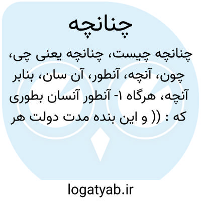 ۱- آنطور آنسان بطوری که: (( و این بنده مدت دولت هر قوم چنانچه در تواریخ یافته... ) ) ( تاریخ گزیده ): (( در اجرائ حکم سیاست بروی از زبان بریدن و میل کشیدن چنانچه اعتبار تمامت غمازان و مفسدان و مستخر جان گردد. ) ) ( ترجم. محاسن اصفهان ) ۲ - از ادات شرط و تعلیق اگر: (( چنانچه راستکار باشی رستگار شوی. ) ) یا اگر چنانچه. اگر مثلا اگر (( اگر چنانچه پسندیده است فمرحبا و اگر بخلاف این فرمانی بود در عهد. شکستن نباشم که فرمان سلطان باضطرار لازم بود... ) ) ( مجموع. مکاتیب غزالی )