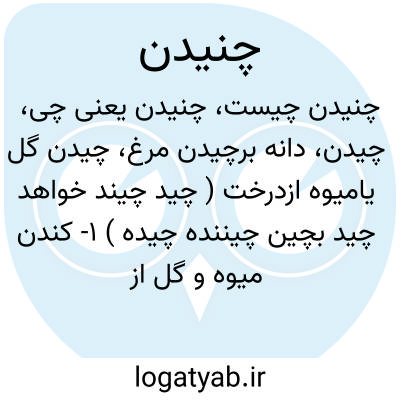( چید چیند خواهد چید بچین چیننده چیده ) ۱- کندن میوه و گل از درخت. ۲ - انتخاب کردن گزیدن. ۳ - دانه برداشتن مرغ از زمین و فرو بردن. ۳ - زدن شاخه های گیاه. ۵ - گرفت ناخن. ۶ - سترون موی. ۷ - بر بالای هم گذاشتن چیزی. ۸ - گستردن متاع با نظم و ترتیب پهن کردن بساط.