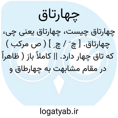 چهارتاق. [ چ َ / چ ِ ] ( ص مرکب ) که تاق چهار دارد. || کاملاً باز ( ظاهراً در مقام مشابهت به چهارطاق و چهارطاقی ) صفت دری که کاملاً باز باشد. رجوع به چهارطاق شود:در چهارتاق است؛ که هر دو لنگه آن به کلی بازست.