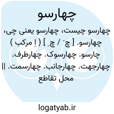 چهارسو. [ چ َ / چ ِ ] ( اِ مرکب ) چارسو. چهارسوک. چهارطرف. چهارجهت. چهارجانب. چهارسمت. || محل تقاطع دو بازار. آنجا که دو بازار مانند صلیب هم را قطع کنند: