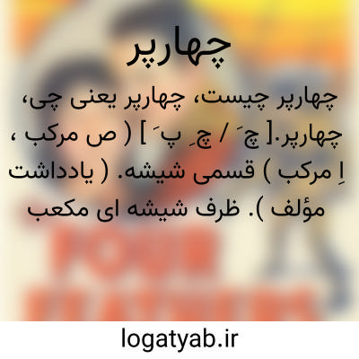 چهارپر.[ چ َ / چ ِ پ َ ] ( ص مرکب، اِ مرکب ) قسمی شیشه. ( یادداشت مؤلف ). ظرف شیشه ای مکعب مستطیل شکل که آب یا نوشابه را بکار دارند. || چهارپهلو. || دارای چهارپره. || قسمی چماق که بر سرآن آهنی گنده و چهارپر است. ( یادداشت مؤلف ). || دارای بال برای پریدن. رجوع به چارپر شود.