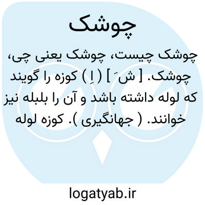 چوشک. [ ش َ ] ( اِ ) کوزه را گویند که لوله داشته باشد و آن را بلبله نیز خوانند. ( جهانگیری ). کوزه لوله دار را گویند. ( برهان ) ( فرهنگ نظام ) ( ناظم الاطباء ). کوزه لوله دار کوچک مأخوذ از چوشیدن که بمعنی مکیدن است. ( آنندراج ) ( انجمن آرا ). بلبلی. چون لوله آن رادر دهن گذاشته آب میخوردند. شاید تشبیه به مکیدن پستان شده که چوشیدن است. ( فرهنگ نظام ). کوزه کوچک آبخوری. از چوشیدن است یعنی مکیدن. ( یادداشت مؤلف ).