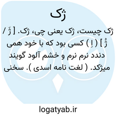 ژک. [ ژَ / ژُ ] ( اِ ) کسی بود که با خود همی دندد نرم نرم و خشم آلود گویند میژکد. ( لغت نامه اسدی ). سخنی که از روی غضب وخشم در زیر لب گویند. کسی که با خود همی تندد. در شیراز و خراسان لُنْد گویند. ( برهان ). سخنی بود که ازروی خشم و اعراض در زیر لب گویند و آن را دندنه نیزخوانند و ژکیدن مصدر آن است. ( جهانگیری ). کسی بود که با خود می تندد و میگرید نرم نرم به تندی و خشم آلودگی گویند همی ژکد و سودائی مزاج بود که با خود گوید و گرید. زُک. لُند. لُندش ِ زیر لب. لُندلُند. غر و لُند. || ( فعل امر ) امر به ژکیدن. ( برهان ).