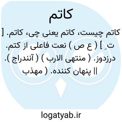 کاتم. [ ت ِ ] ( ع ص ) نعت فاعلی از کتم. درزدوز. ( منتهی الارب ) ( آنندراج ). || پنهان کننده. ( مهذب الاسماء ). پوشنده. رجوع به پوشنده شود. آدم محرم. سرپوش. || نهفته. سرٌ کاتم ٌ؛ راز نهان داشته. ( منتهی الارب ) ( آنندراج ). || قوس ٌ کاتم ٌ؛ بمعنی قوس کتیم است. ( منتهی الارب ). کمان از چوب ناشکافته یا کمان سوفارناکرده.( آنندراج ). کاتمة، مثله. ( منتهی الارب ) ( آنندراج ).