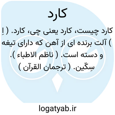 ( اسم ) آلتی مرکب از تیغ. آهنین یا فولادین که دارای دسته ای چوبین یا فلزی است و برای بریدن چیزها مانند میوه گوشت و غیره بکار رود: [ هر زنی را از ایشان ترنجی داد و کاردی ]. ( ترجمه. تفسیر طبری ) یا کارد جراحی. ۱ - کاردی که بهنگام عمل جراحی بکار برند. ۲ - نیشتر نشتر یا کارد قصابی. کاردی بزرگ که قصابان بکار برند ساتور. یا کارد قلم. قلمتراش. یا کارد گوشت کوب. کارد و چنگال. ۱ - کارد همراه چنگال ۲- ( بطور اطلاق ) لوازم سفره از کارد چنگال قاشق. یا کارد باستخوان آمدن ( رسیدن ). بستوه آمدن بلب رسیدن: [ کار ستمت بجان رسیده است وین کارد باستخوان رسیده است ]. ( اخسییکتی ) یا کارد بحلق مالیدن. سر بریدن گلو بریدن ذبح کردن. یا کارد بر سر بردن. بریدن سر. یا کارد بر سر قلم بردن. تراشیدن آن: [ قلم سر سلطان چو نیکو نهفت که تا کارد بر سر نبردش نگفت ]. ( بوستان ) یا کارد برکشیدن. بر کشیدن کارد بیون آوردن آن از غلاف سل. یا کارد در پا افکندن ( انداختن ). سخت و دشوار گردانیدن کار. یا کاردش میزدی خونش ( در ) نمیامد. ( بتعبیر مثلی ) بسیار عصبانی بود: [ شوهرش با تبسم تلخی که روی لبانش خشکیده بود بی آنکه حرفی بزند عکس را گرفت کاردش میزدی خونش در نمیامد. ( شام ۳۹۷ ) یا ( مثل ) کارد و پنیر بودن. سخت دشمن یکدیگر شدن.