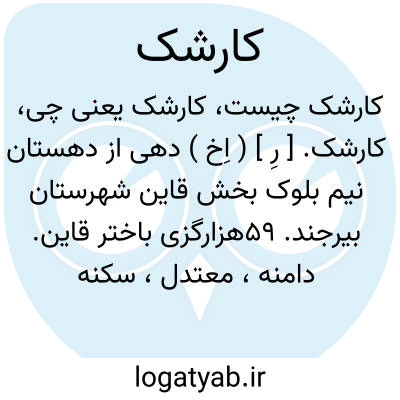 لغت نامه دهخدا: کارشک. ( اِخ ) دهی از دهستان نیم بلوک بخش قاین شهرستان بیرجند 59هزارگزی باختر قاین، دامنه، معتدل، سکنه 559 تن، قنات دارد. ( فرهنگ جغرافیایی ایران ج 9 ).
