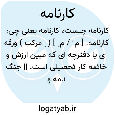 ( اسم ) ۱ - کتابی که شامل سر گذشت و شرح اعمال شخصی یا اشخاص بزرگ باشد: کار نام. اردشیر بابکان کار نام. شاهان و مهتران: [ فسان. کهن و کار نام. بدروغ بکار ناید رو در دروغ رنج مبر ]. ( فرخی ) ۲ - ورقه یا دفتر چهای که اولیای مدرسه بهر شاگر ( دانش آموز دانشجو ) اختصاص دهند و در آن نمره های دروس و اخلاق و انضباط و معدل نمرات و قبول یا تجدیدی و یا رد شدن او را در امتحانات ظرف سال یا پایان آن ثبت کنند. یا کار نامه تحصیلی. ۳ - جنگ نامه. ۴ - تاریخ. ۵ - مجموعهای از تصاویر یک نقاش مرقع تصاویر برای اظهار کمال خود تیار کند ( غیاث ): [ نگاه کن که بنو روز چون شدست جهان چو کار نام. مانی در آبگون قرطاس ]. ( منوچهری ) ۶ - کار و هنر و صنعتی که کمتر کسی از عهد. آن بر آید: [ خوش کار نامه ایست که آمد بروی کار این کار از تو آید و مردان چنین کنند ]. ( بنقل انند ) - اعلان دستکار. ۸ - جواز. ۹ - قصد اراه.